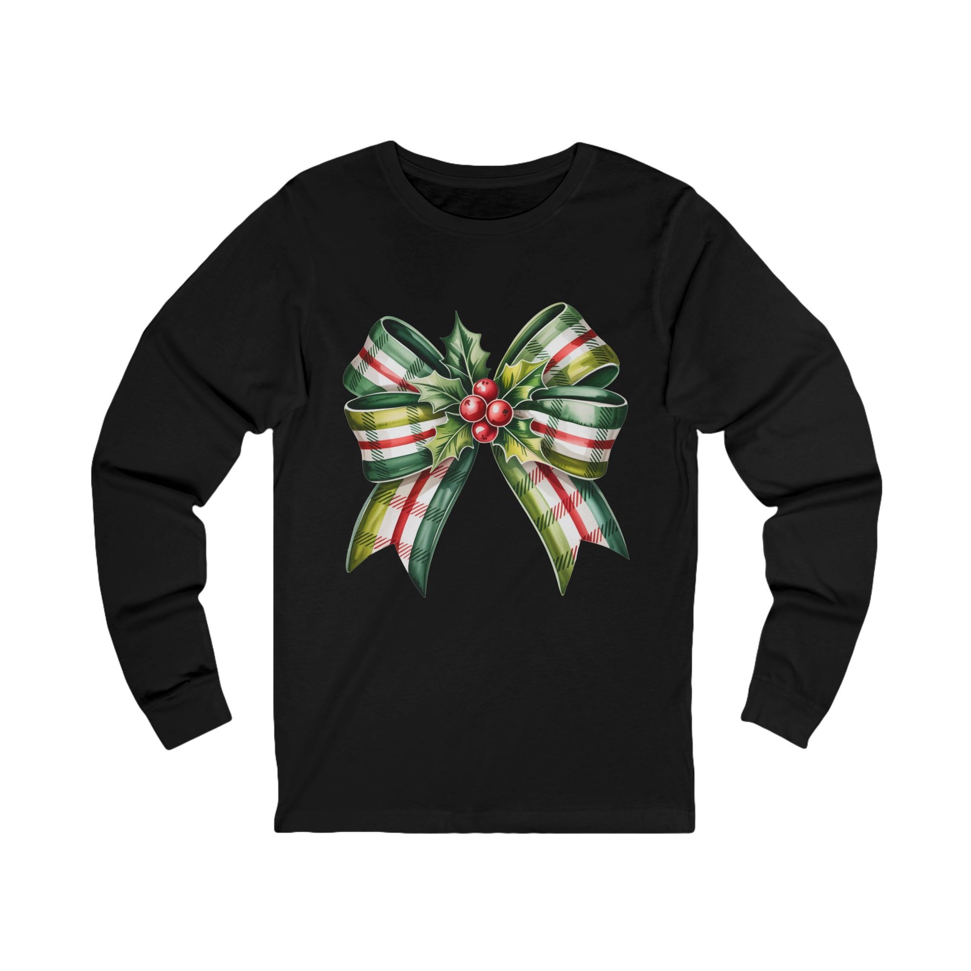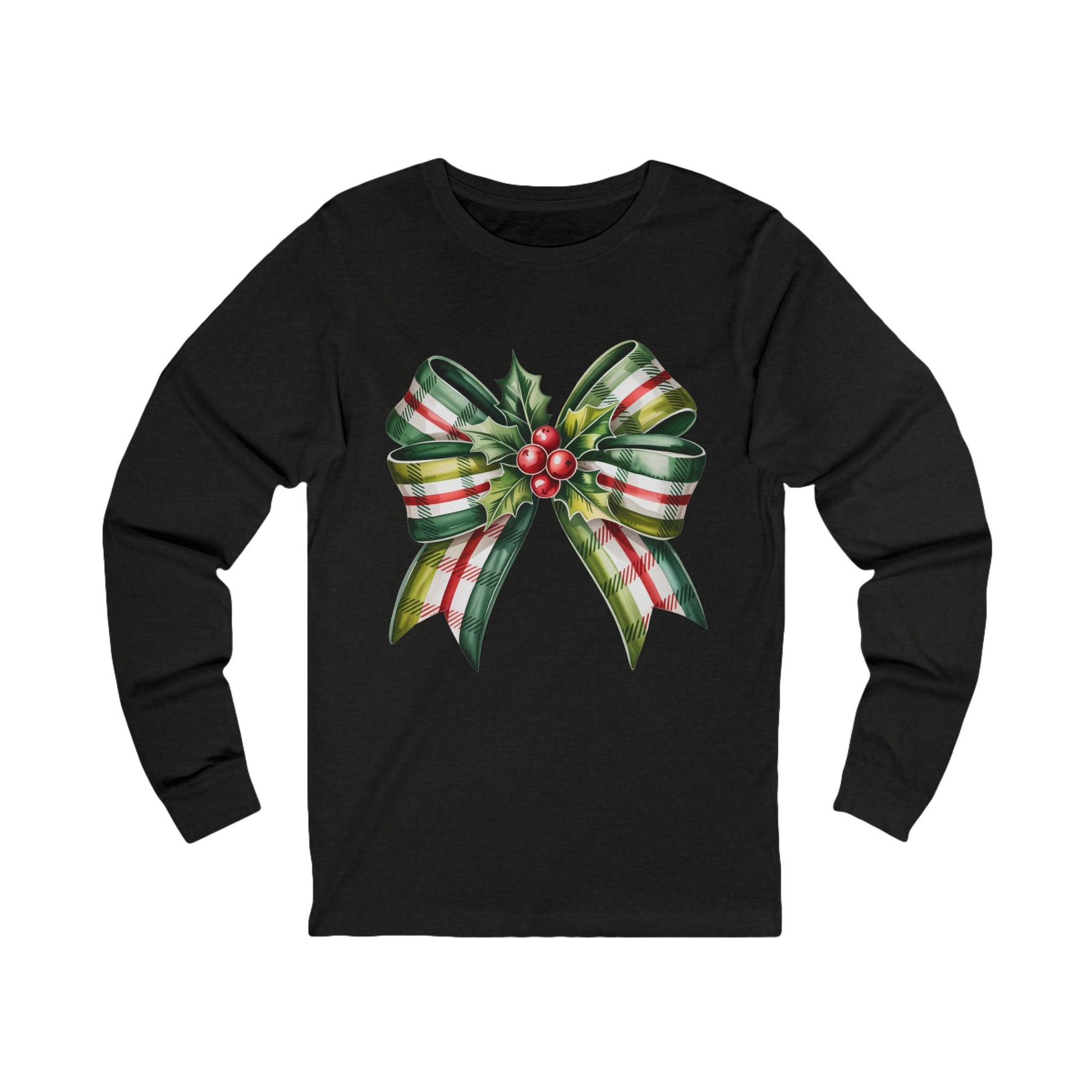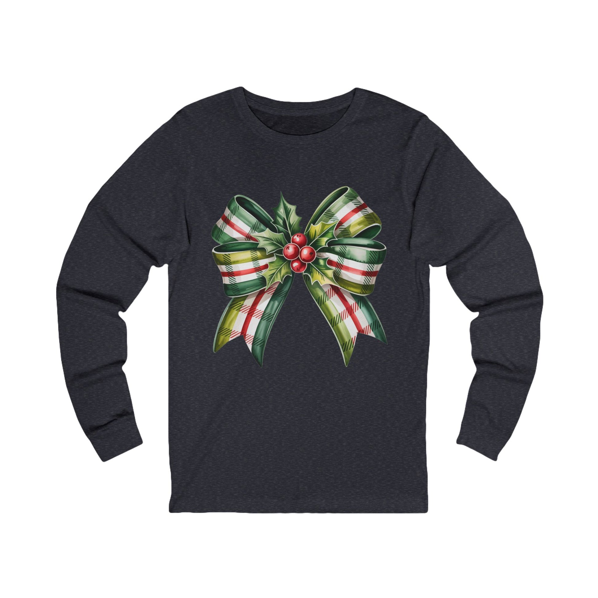 Christmas Plaid Bow Long Sleeve Tee — Holiday Holly Ribbon Shirt
