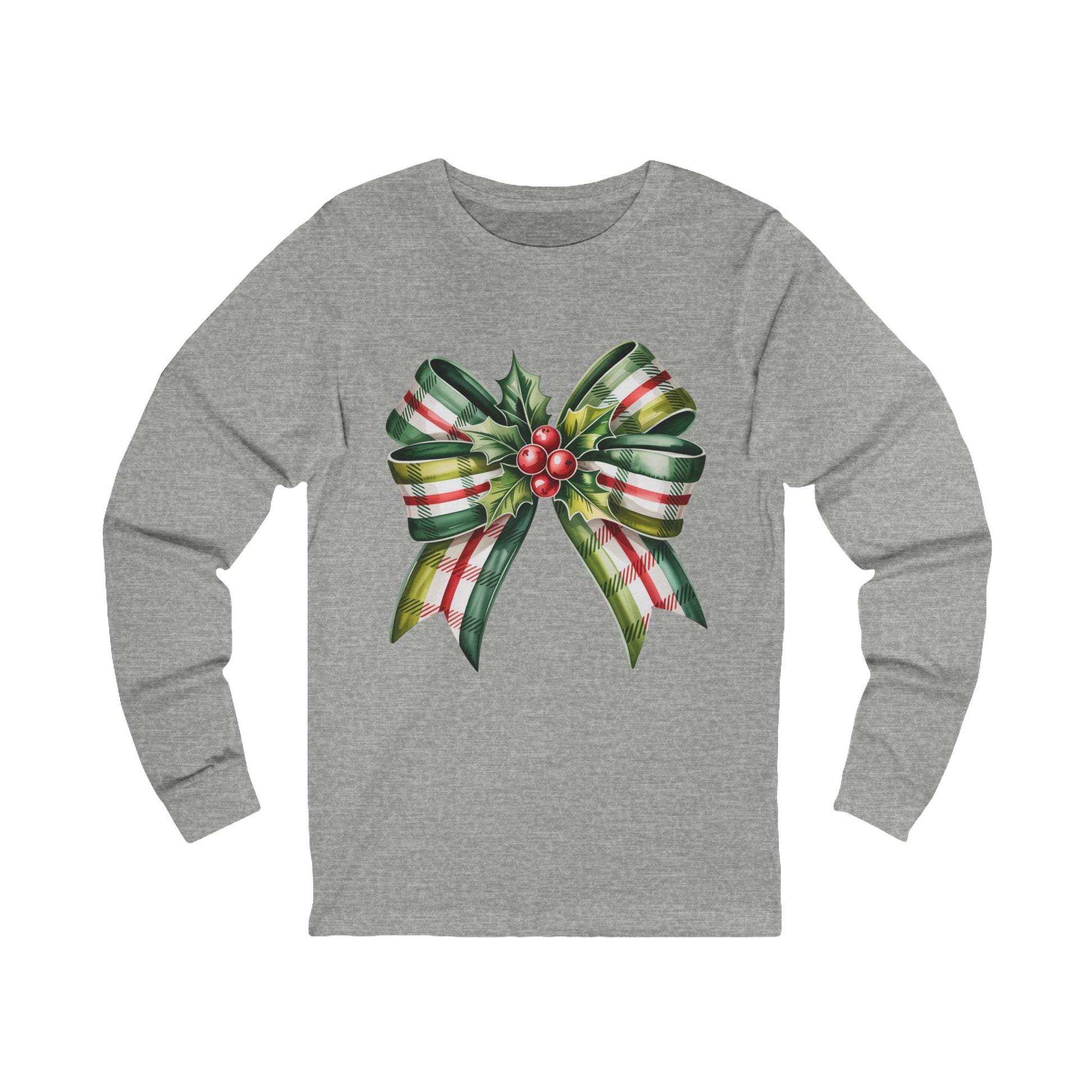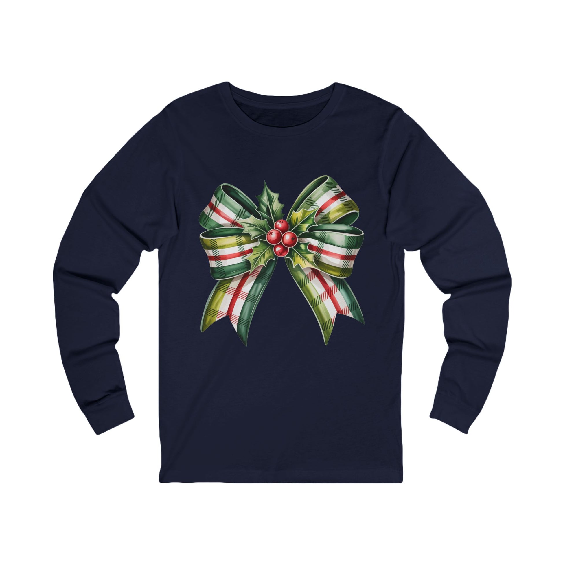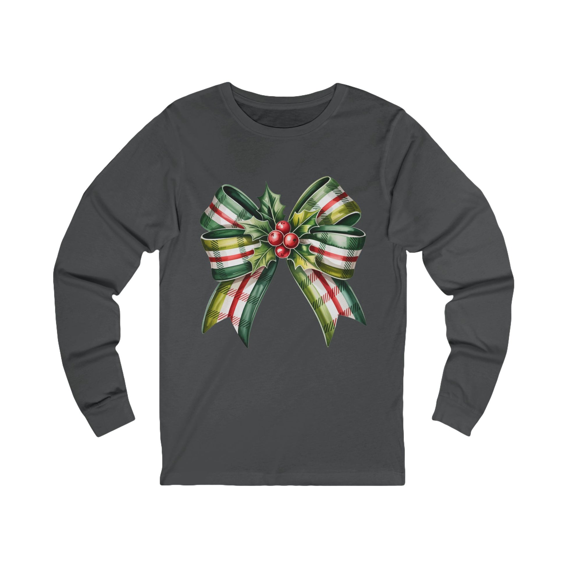 Christmas Plaid Bow Long Sleeve Tee — Holiday Holly Ribbon Shirt